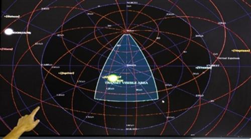 15日,工作人员在中科院国家天文台兴隆观测基地介绍郭守敬巡天望远镜观测计划显示系统