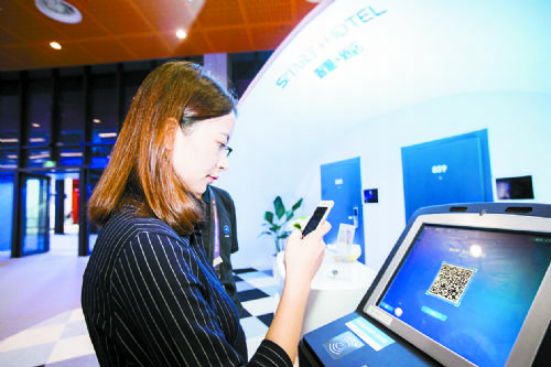 在云栖大会蚂蚁金服的ATEC展馆的智慧酒店,用户只要有支付宝,即可刷脸入驻,凭芝麻分免押金,还能在退房、结账、开票各个环节中享受到便捷的自助服务。这是蚂蚁金服与合作伙伴基于支付、信用、物联网等技术,共同开发的NEXT酒店智能化解决方案。