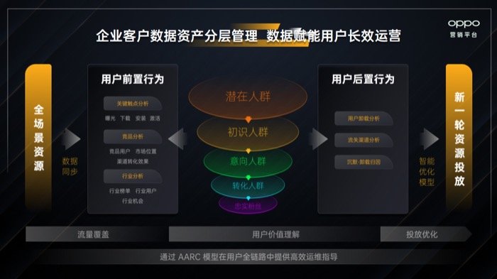 首先,在寻找目标受众方面,Accurate(精准触达)是OPPO营销利用终端媒体系统优势所构建的底层能力。在移动互联网时代,终端媒体是信息与数据的海洋,其能够打破App数据孤岛,提供跨App的数据能力,并洞察用户在系统中的搜索行为及意图,在深度和广度上同时提供精准的触达能力。有了众多的用户数据来源后,经过DataMiner智能大脑的整合,OPPO营销构建了丰富的标签系统和人群画像,从而应用在客户的预算分配、人群圈取、相似人群拓展等的场景,精准地指导广告主决策。同时,基于AARC模型,对企业客户的数据资产进行分层管理,帮助客户进行数据运营分析,做出更科学的营销决策,赋能用户长效运营。