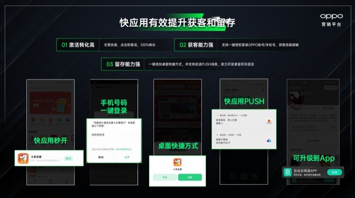 快应用作为终端媒体特有的应用场景,具备无需安装、即点即用的特性,能够在广告投放和业务转化流程中有效提升效率。例如,快应用可以点击即激活,省去下载和安装的流程。另外还可以支持创建桌面快捷方式,并可以在后续升级为App,完成转化。为了帮助客户快速迁移,平台还支持使用迁移工具从小程序零成本直接转移,降低营销成本。