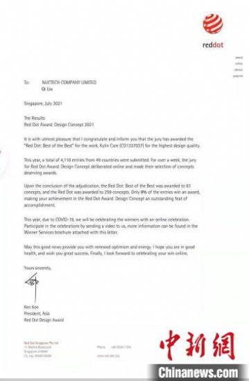 同方威视的医院安检设备Kylin care新近摘取2021年度德国红点最佳设计奖。图为获奖证书。 同方威视供图