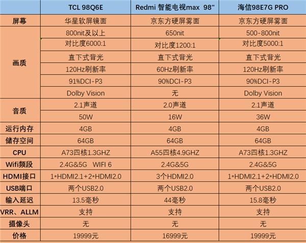 在价格方面,小米以16999元成为最低价,TCL 98Q6E和海信98E7G PRO价格为19999元。Redmi智能电视MAX 98在价格上一直有优势,但它的亮度、对比度、刷新率、杜比音画、声道、音响、CPU、HDMI、输入延迟等方面较其他两款逊色,这样的价格也是理所应当。