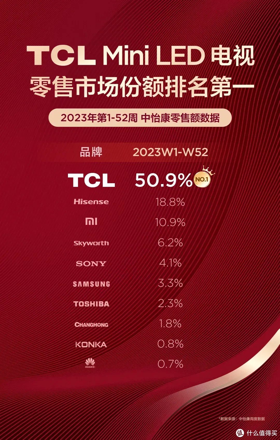 能实现IMAX影院级享受的的大屏电视不多,TCL 115"X11G Max电视可以说是无论屏幕、画质还是音效都最接近IMAX影院级的大屏Mini LED电视。说起TCL,作为大屏Mini LED电视领域的领跑者,TCL在全球大屏Mini LED市场拥有着绝对的竞争力,根据中怡康2023年第1-52周的零售额数据,中国自主品牌TCL在Mini LED电视的市场份额高达50.9%,如今在中国每卖出2台Mini LED电视,就有一台来自TCL。另外根据最新的销量数据,2023年TCL的电视销量已经跃居全球第二,位居国产品牌第一。