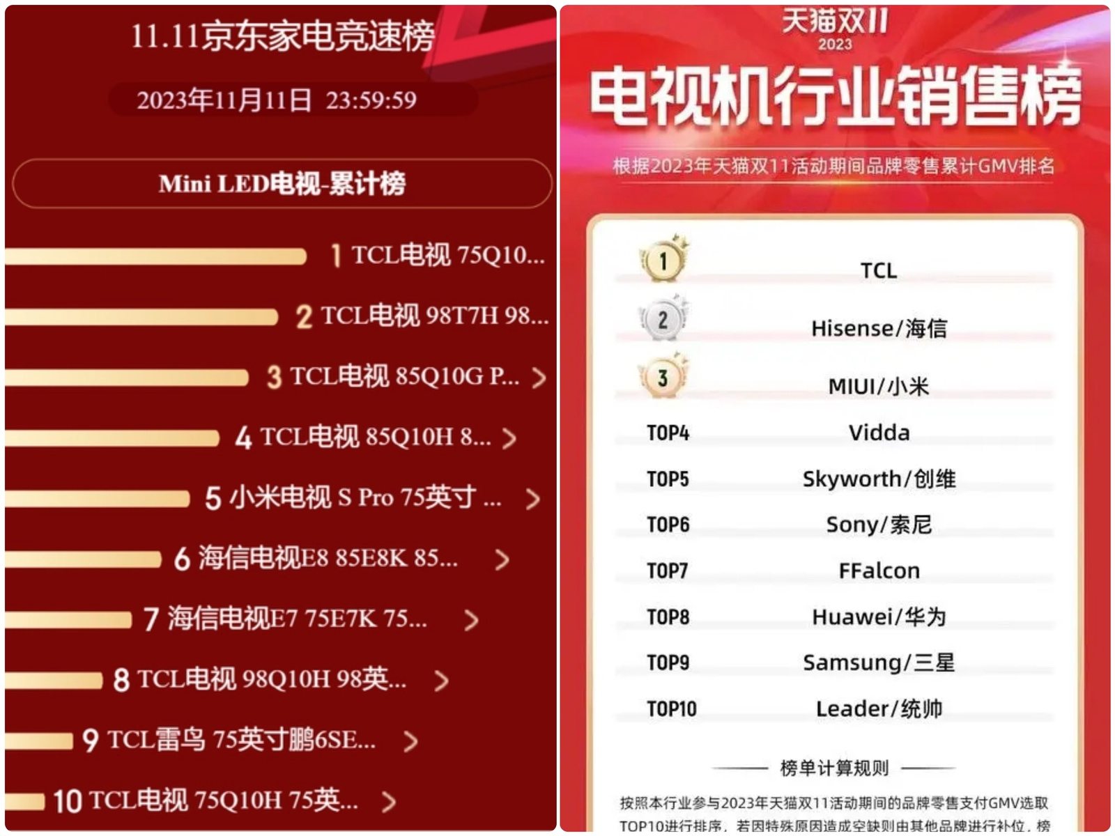 虽然开年大家都在说自己各种定义的“第一”,百家都欢喜,但真正的第一是消费者的投票,尤其是在去年的618和双十一,TCL电视可谓是“杀疯了”,在京东和天猫分别公布的电视销售榜最终战绩中,TCL电视遥遥领先,不仅在京东平板电视成交排行榜中名列第一,同时天猫电视机行业销售榜中位居榜首,独占电视行业鳌头,深受消费者的青睐。