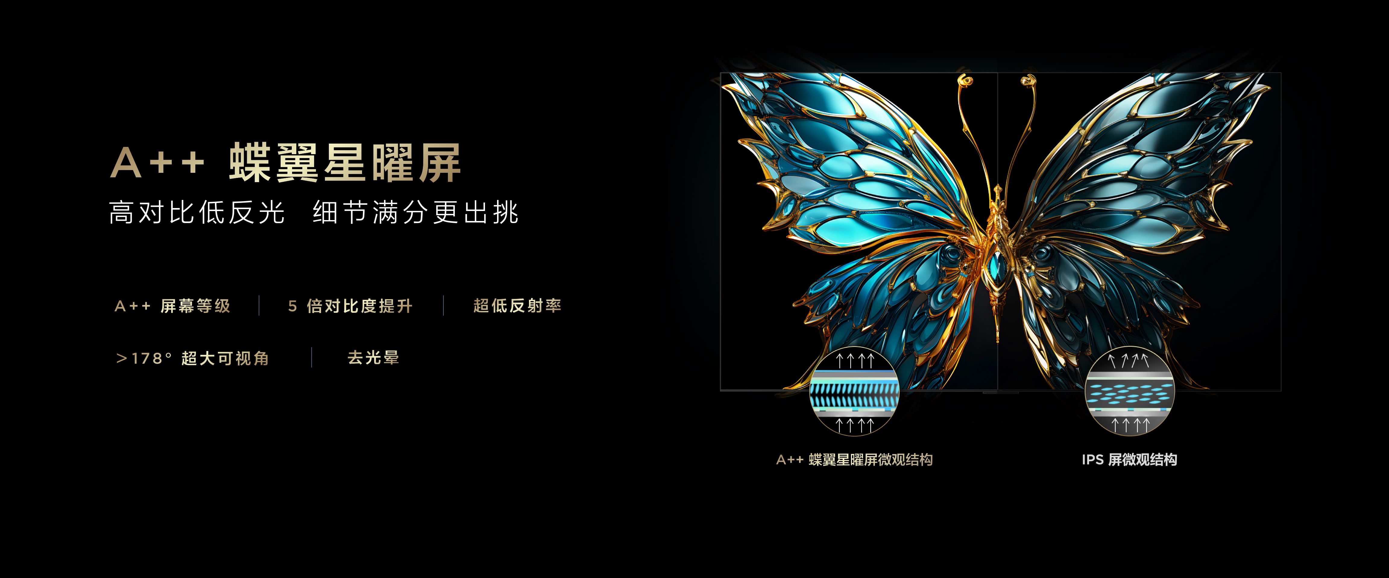 此外,A++蝶翼星曜屏技术的应用也有效降低了环境干扰。这款屏幕具有抗反光功能,不会因为观看角度的变化而产生反光或视觉失真。这意味着无论你在哪个位置观看电视,都能获得清晰、稳定的画面效果,让视觉体验质量不受影响。