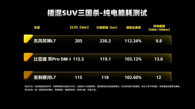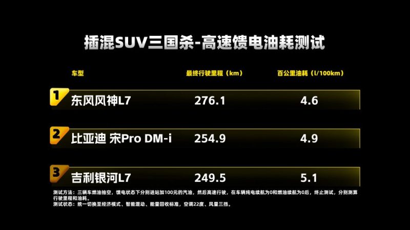 近日,知名汽车媒体30秒懂车举办了一场名为“插混SUV三国杀”活动,对这三款热门插混SUV进行了全面对比测试。测试基于相同测试标准,从纯电续航里程、续航达成率、混动模式油耗、高速能耗表现、场地极限性能以及智能驾驶辅助系统等多个角度,对东风风神L7 205 Plus版与比亚迪宋Pro荣耀版DM-i 110km超越型、银河L7 2024款1.5DHT 115km PLUS龙腾版(下称:东风风神L7、比亚迪宋Pro DM-i及银河L7)进行对比测试,力求用户真实用车场景,从而为消费者提供一个更为贴近实际使用情况的价值参考,评测出谁才是同级中最具价值,用户选车的最优解。
