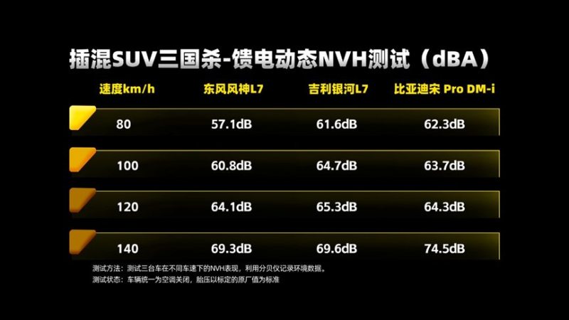 动力与油耗之外,安静舒适的驾驶体验才是真日常,NVH测试无疑也是大家关注的重点。测试三台车在不同速度下的NVH表现,80km/h旨在模拟城市道路(环路、快速路限速);100-140km/h公里模拟高速公路下NVH表现,测试方法为空调关闭,车辆胎压以标定的原厂值为标准。