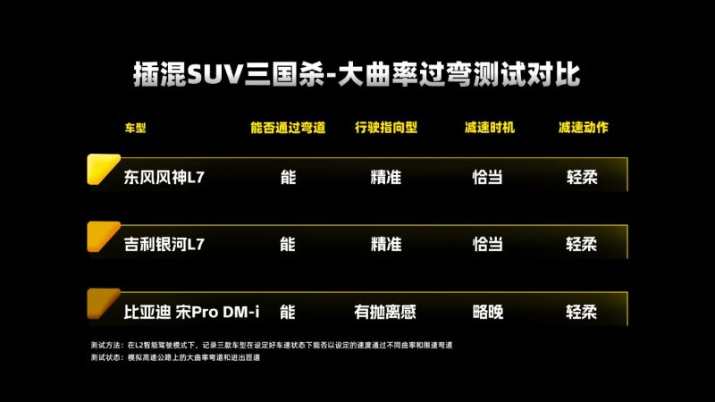 三辆车的电耗、油耗、性能都评测完毕,接下来我们看看这3款最强主流插混SUV的智能驾驶系统实战表现。L2级智能辅助驾驶大家都不陌生,它是围绕自适应巡航功能做文章,车辆自身可以提供加减速、转向和车道保持功能。两个测试项目大曲率弯道,看看测试车辆能否像老司机一样减速慢行,还有就是面对加塞时又是如何应对的。目的就是还原日常驾车场景,看看在同一标准下三款车的智能驾驶表现如何。