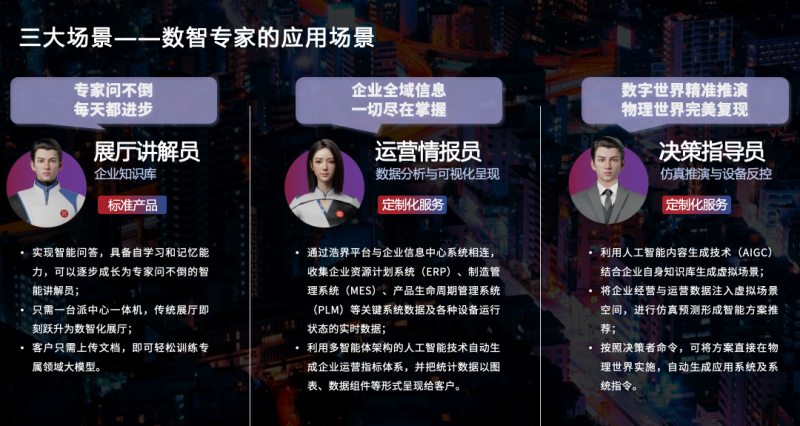 派老师可以扮演任何角色:可以是展厅讲解员,实现智能问答,使传统展厅即刻跃升为数智化展厅;可以是运营情报员,通过与企业信息系统相连,关键系统数据及设备运行状态实时数据,自动生成可视化的企业运营指标体系;也可以是决策指导员,利用AIGC与企业自身知识库生成虚拟场景,通过仿真预测形成智能方案推荐,辅助领导者进行决策。