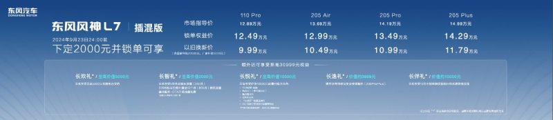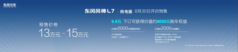 在不久前亮相的东风风神L7纯电版已开启预售,价格为13万元-15万元。截至9月23日,9.9元预订即可享受约8000元购车权益,助力用户开启更加美好的拥车生活。不仅如此,东风风神L7插混版用户权益也再次升级:截至9月23日,2000元下定并锁单,可享至高2000元抵9000元,同时享受25000元以旧换新补贴,除此之外,还额外享受至高30999元权益。