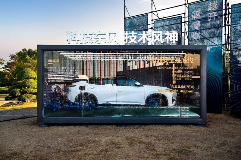 为了让用户更直观地了解马赫电池的安全性,发布会现场东风风神带来了“MINI”版的泡水测试,以及惊心动魄的穿越火线极限挑战。沉浸式实车浸水测试展示区,向到场嘉宾直观展示了东风风神L7 EV强悍的安全基因,浸水展示车辆同步现场外放电的场景,更是令人眼前一亮。