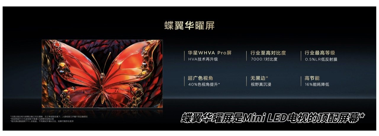 蝶翼华曜屏不仅拥有7000:1超高原生对比度,还能有效减少光晕和漏光问题,让黑场表现更加纯净。同时还搭载了行业顶级的0.5%LR低反射膜,结合40%超广色视角提升,不论你站在哪里,哪个角度观看,画面始终清晰、无炫光,保证每个人都能享受IMAX级的视觉体验,再也不用担心坐在沙发最边上而看不清楚电视屏幕。