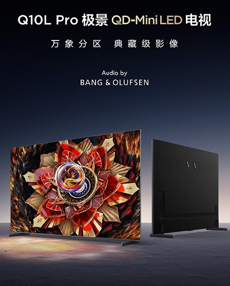 就在这场发布会上TCL正式推出行业首款第四代液晶电视 ——Q10L 系列极景 QD-Mini LED电视。Q10L系列以“极景·无黑边”形态重构、蝶翼华曜屏、万象分区控光技术为核心,彻底打破传统电视的体验边界。并且还携手世界顶奢级音响品牌B&O进行了独家深度定制音效、搭载全新升级的TSR AI独立画质芯片与灵控系统3.0,从视觉到交互全面升级,提前锁定2025年度旗舰电视的“王炸”地位。