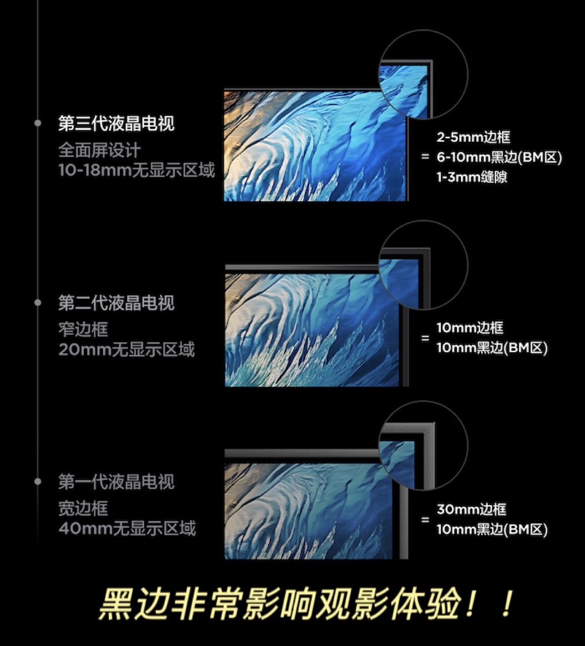到了2012年,第二代液晶电视开始采用窄边框设计,但还是有10mm的边框和10mm的屏幕黑边;等到2016年,第三代液晶电视虽说引入了全面屏设计,边框缩小至2-5mm,但仍有黑边和缝隙,整体视觉效果依然不完美。
