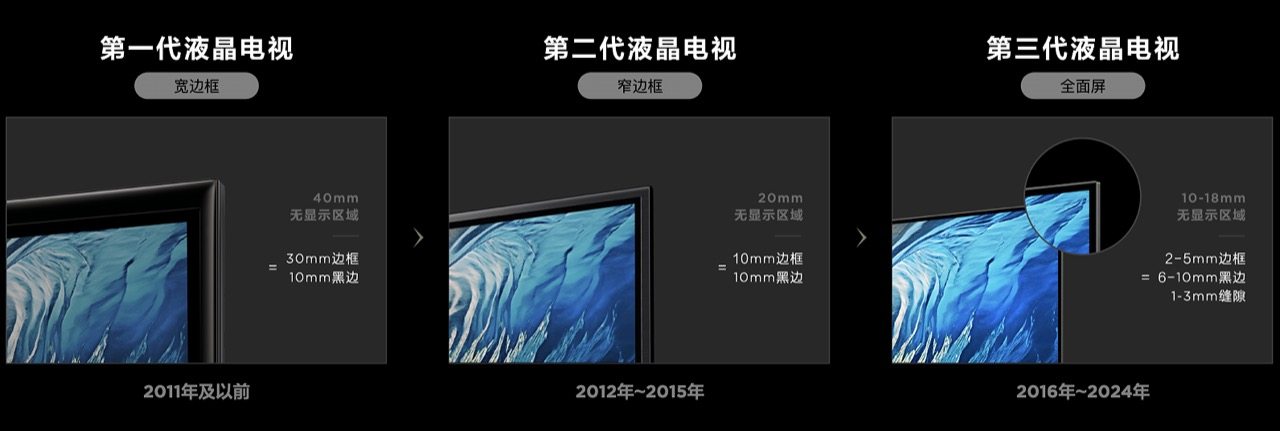 回顾液晶电视形态的发展大致可分为三代。第一代液晶电视拥有30mm的超粗边框以及10mm的黑边,外观和视觉体验都还有极大的优化空间,而第二代虽然已由“粗边框”进化为了“窄边框”,但依旧保有10mm边框+10mm黑边,再到第三代液晶电视,已采用了主流的全面屏设计方案,然而黑边和边框以及缝隙依旧存在,无显示区域达到10-18mm,由于技术及工艺的受限,在近十年这一困局一直未被打破。