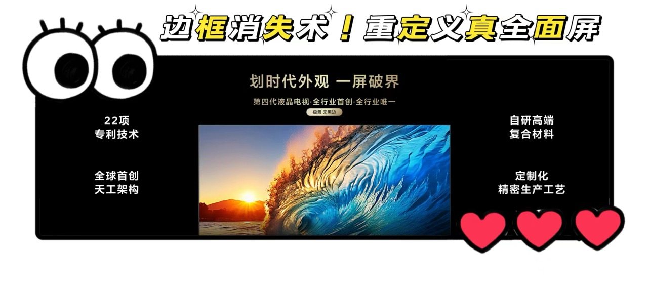 当我们观看电视时,偶尔会发现画面周围出现黑边,加上电视粗粗的边框,这在视觉上就会让人感到别扭。尤其是看电影、追剧的时候,当你想要沉浸进去,却又被旁边的黑边和边框悄悄提醒“这是块屏幕”,难免让人扫兴。可以说,液晶电视行业苦边框、黑边久矣!而如今TCL用行业首创的"极景・无黑边"技术彻底终结了屏幕边框黑边的时代。凭借全球首创的天工架构和22项专利技术,TCL从架构设计、定制材料到生产工艺全链路升级,彻底跟碍眼的边框和黑区说拜拜,同时屏幕采用的反射光学材料较普通材料光效提升97%,还耐高温耐黄化,以及纳米级炭黑吸光材料能达到超过99.9%的光线吸收率,让画面的稳定性极大提升!观影时边框黑边统统直接消失,满眼都是画面,沉浸感炸裂——这观影体验也就第四代液晶电视才能实现了!!建议大厂们的工程师集体研究进修下,看看什么才叫真・全面屏。