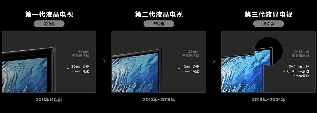 过去,电视有大黑边似乎已经成了我们普通消费者“默认”的不可避免“缺陷”,毕竟回顾液晶电视形态发展的三个阶段,如今第三代液晶电视10-18mm的不显示区域,已比第一代的超粗款液晶电视来得强太多,光是黑边就高达30mm,而想要去除黑边,让电视颜值更高,观影体验更沉浸,难度似乎不小,这也导致了行业在第三代后停滞了将近10年!