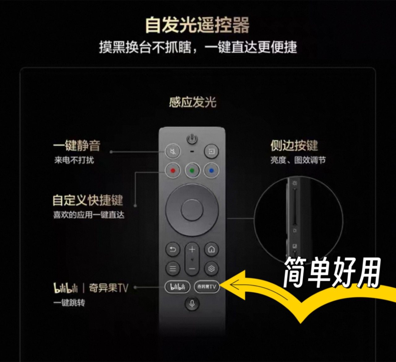 加上沿用了它家像手机系统一样好用的灵控系统3.0,无开机广告、0.7秒快速开机、定制化桌面等,这些备受消费者喜爱的功能依旧沿用,并且这次还新增了4K UI和4K壁纸,配合会发光的遥控器,金属材质高级感拉满的同时,新增了B站和奇异果TV专属按钮,一键直达,别提多方面,而且因为可自感应发光,即便是关灯情况下也能找到你想要的按钮。