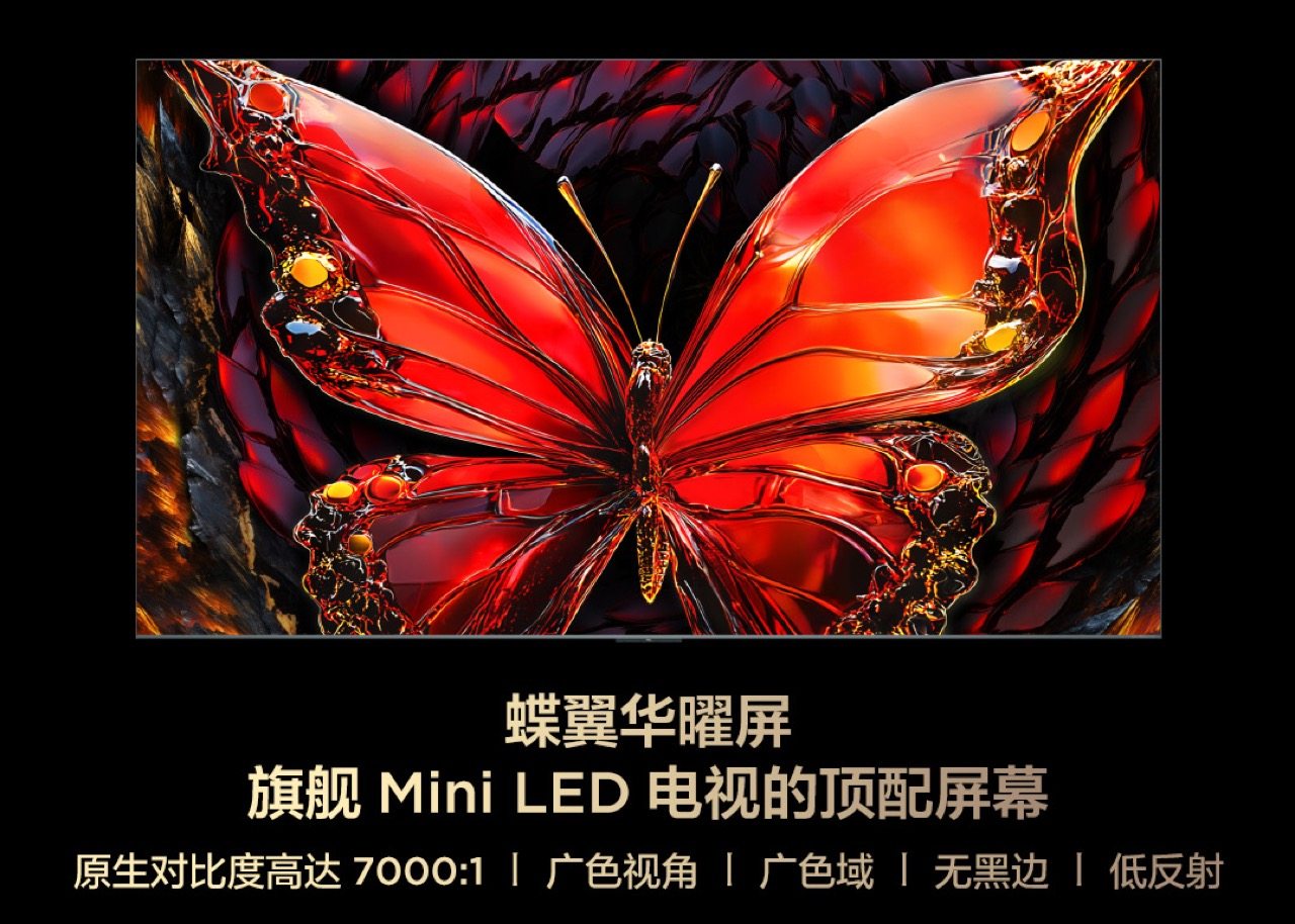 在屏幕上,此次采用的蝶翼华曜屏,可以说是Mini LED电视的顶配屏幕。VA屏本身就凭借5000:1的高对比度,比IPS屏更适合Mini LED电视。华星HVA屏作为高端VA屏,原生对比度高达7000:1,是Mini LED的理想搭档。而蝶翼华曜屏作为HVA屏的最高配版,更是将优势发挥到极致。它利用高分子材料聚酰亚胺,使液晶分子呈蝶翼状排列,遮光能力更强,响应速度更快,能精准控制光线走向,对比度进一步提升到7000:1,是普通IPS屏的5倍,控光能力更强、暗态效果更好。