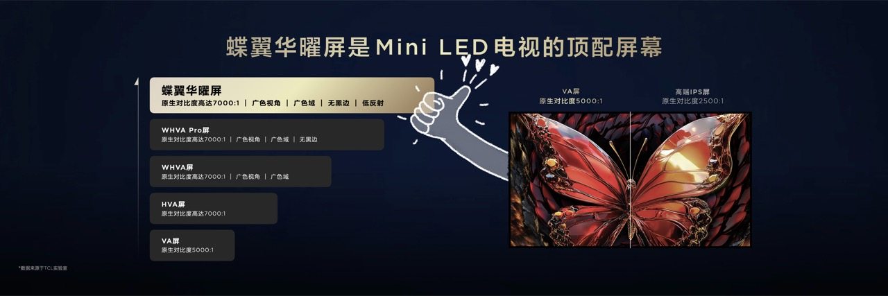 在成像显示的最后一环——屏幕上,Q10L系列采用的蝶翼华曜屏。这款Mini LED的顶配屏幕,它的液晶分子呈“蝶翼”状排列,遮光能力强,能精准控制光线走向。原生对比度达到7000:1,是普通IPS屏的5倍,控光能力强、暗态效果更好、响应速度更快 。而且超广色视角相比VA屏提升40%,就算侧边看电视,画面内容和色彩也能看得清清楚楚。这块屏幕另一大亮点是搭载了行业里最高端的仅有0.5%最低反射率的LR低反膜,不管白天黑夜,电视画面即不会受到外部强光干扰,还能解决屏幕倒影问题,画面纯净不泛白,看起电视来特别沉浸。