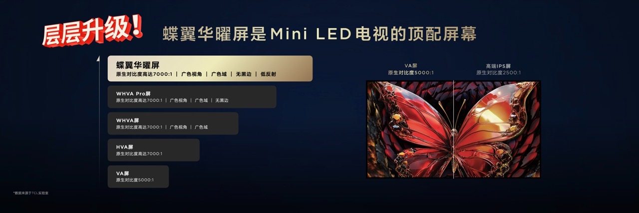 当同行还在想尽办法提升对比度的时候,TCL已经靠蝶翼华曜屏再次突破了Mini LED画质上限!众所周知,华星HVA屏凭借着极高的对比度,早已在业内“杀出重围”,成为众多消费者的屏幕首选,而Q10L系列搭载的蝶翼华曜屏是华星HVA屏的升级版!在华星HVA屏7000:1极高对比度的基础上增加超广色视角、广色域和无黑边设计,并采用了行业最高端的0.5%超低反射率的低反膜,蝶翼华曜屏就是Mini LED顶配中的顶配!