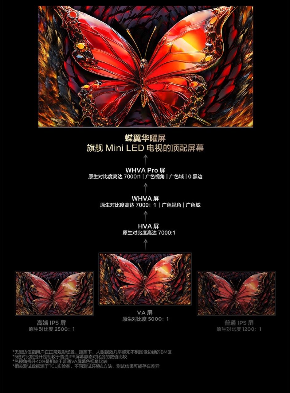 众所周知,Mini LED电视通过提升亮度和对比度来优化画质,配合更高对比度的屏幕,能够更好地发挥其画质优势。TCL C12K搭载的蝶翼星耀屏,是华星HVA屏的最高配版,原生对比度高达7000:1,使黑色更深邃,色彩对比更加鲜明,细节层次更加丰富。同时配备行业领先的0.5%LR低反射膜,有效降低屏幕反光,无论白天还是夜晚,都不会被环境光或是反射干扰;而且新增的超广色视角,相比普通VA屏,色彩视角提升40%,从侧面观看也依然清晰细腻,为用户提供极致且流畅的观影体验。