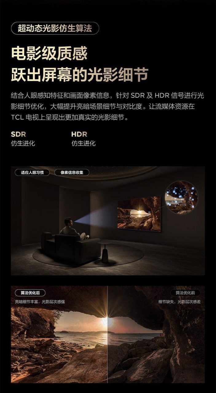与此同时,全新升级的TSR AI独立画质芯片,进一步提升了TCL C12K整体视觉体验。基于TCL自研伏羲AI大模型,凭借行业领先的AI能力,能对画面和观影环境进行全维识别,匹配最优调校算法,对电视内容进行全链路递进式音画质优化。值得一提的是,由于TSR AI独立画质芯片采用云端-终端协同架构,TCL C12K将流媒体片源优化为更高质量片源,2K内容提升4K观影,低画质片源也能呈现清晰的细节和丰富的色彩,提供卓越的观影体验。同时,随着观看内容的增加,就会越懂你的喜好,画质也会越来越好。