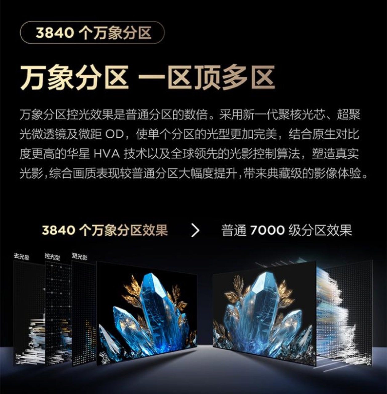 此外,TCL C12K还搭载了广受好评的万象分区技术。TCL从底层技术出发,通过全面升级聚核光芯、超聚光微透镜、微距OD、瞬态响应、双向23bit、超动态光影仿生算法以及华星HVA屏等核心技术,实现了Mini LED从背光到成像的全链路优化,万象分区的控光效果是普通分区的数倍。比如,TCL C12K最高搭载3840个万象分区,控光效果远超传统的7000个普通分区,为用户带来更卓越的画质表现,呈现更加细腻和精准的画面细节。