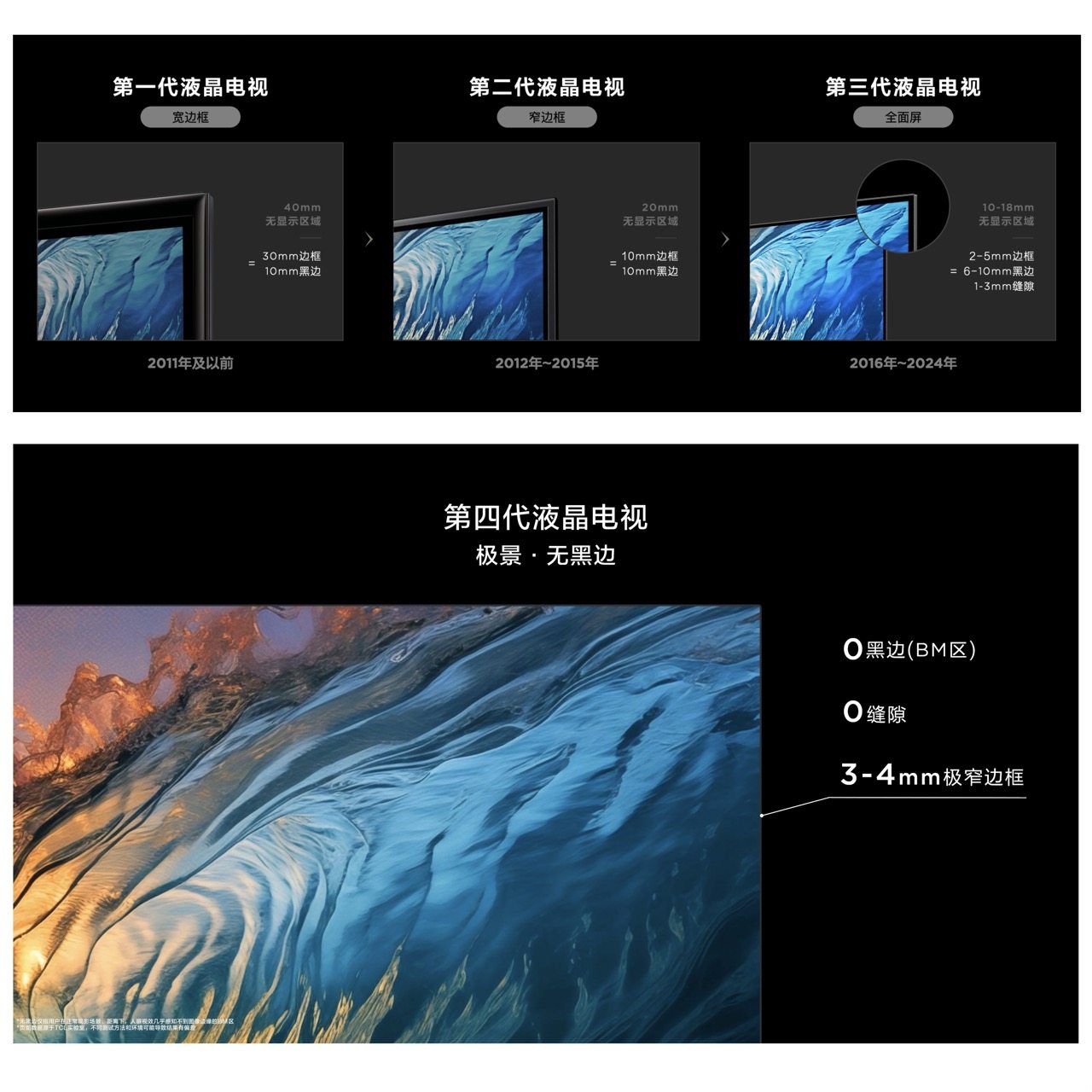 相信不少朋友心中都有疑惑,液晶电视都发展到第四代了,那之前的几代都是什么模样呢?不妨让我们一起来回顾一下液晶电视的进化历程。自2011年液晶电视普及以来,其外观形态已经历经了三次迭代。第一代电视是“超宽边框+10mm黑边”,第二代电视窄边框有所改进,但边框与黑边总仍有20mm左右,到了第三代“全面屏”电视虽有所进步,但仍残留6-10mm黑边,这一路走来,用户始终无法摆脱屏幕物理边界的“干扰”,观看体验总是差那么点意思。但TCL这次横空出世,直接打破了这一尴尬局面,用第四代液晶电视解决了困扰行业多年的“黑边顽疾”,为用户带来近乎无边的视觉享受。