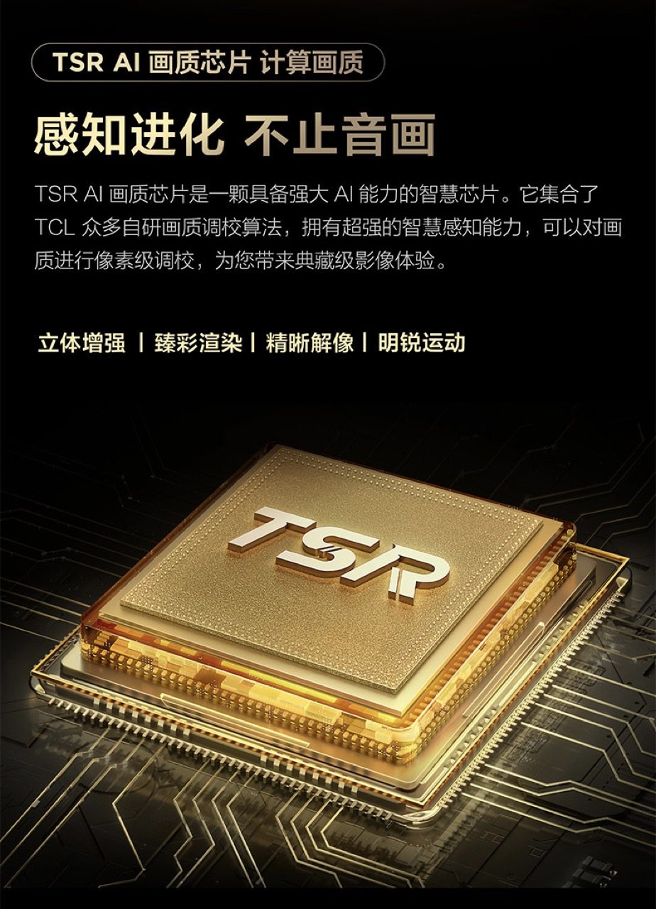 蝶翼华曜屏与万象分区的有机组合,为TCL C12K奠定了卓越画质的基础,而全新升级的TSR AI独立画质芯片,则为其画质注入灵魂。该芯片基于TCL自研伏羲AI大模型开发,融合了TCL强大的AI能力,并采用云端-终端协同架构,让流媒体上1080P以下的视频,也能够以接近4K超清的方式重新呈现,为用户带来实实在在的收益。