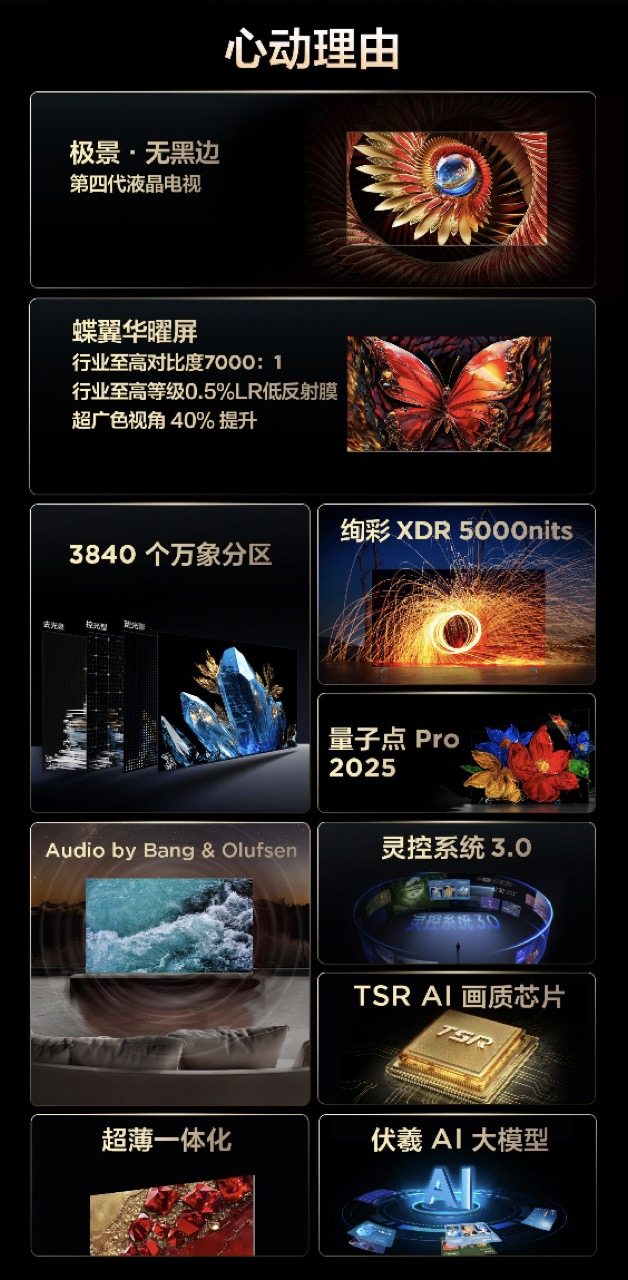 此外,TCL C12K还搭载了TSR AI独立画质芯片,基于TCL自研伏羲AI大模型,通过“云端-终端”的协同架构,在云端逐帧优化画面,终端解决画面拖影、模糊问题,让低质量的流媒体片源在TCL C12K上也有接近4K的清晰度,在AI技术的应用上走在行业前列。同时,试听体验上也得到了极大升级,C12K音响由TCL与国际顶尖音响品牌B&O联合定制,拥有独家臻藏级音效,并且这是首次将HI-END级声学技术引入电视行业,作为家庭音响的最高标准,最大还原自然、立体的音效,呈现出纯臻的质感。