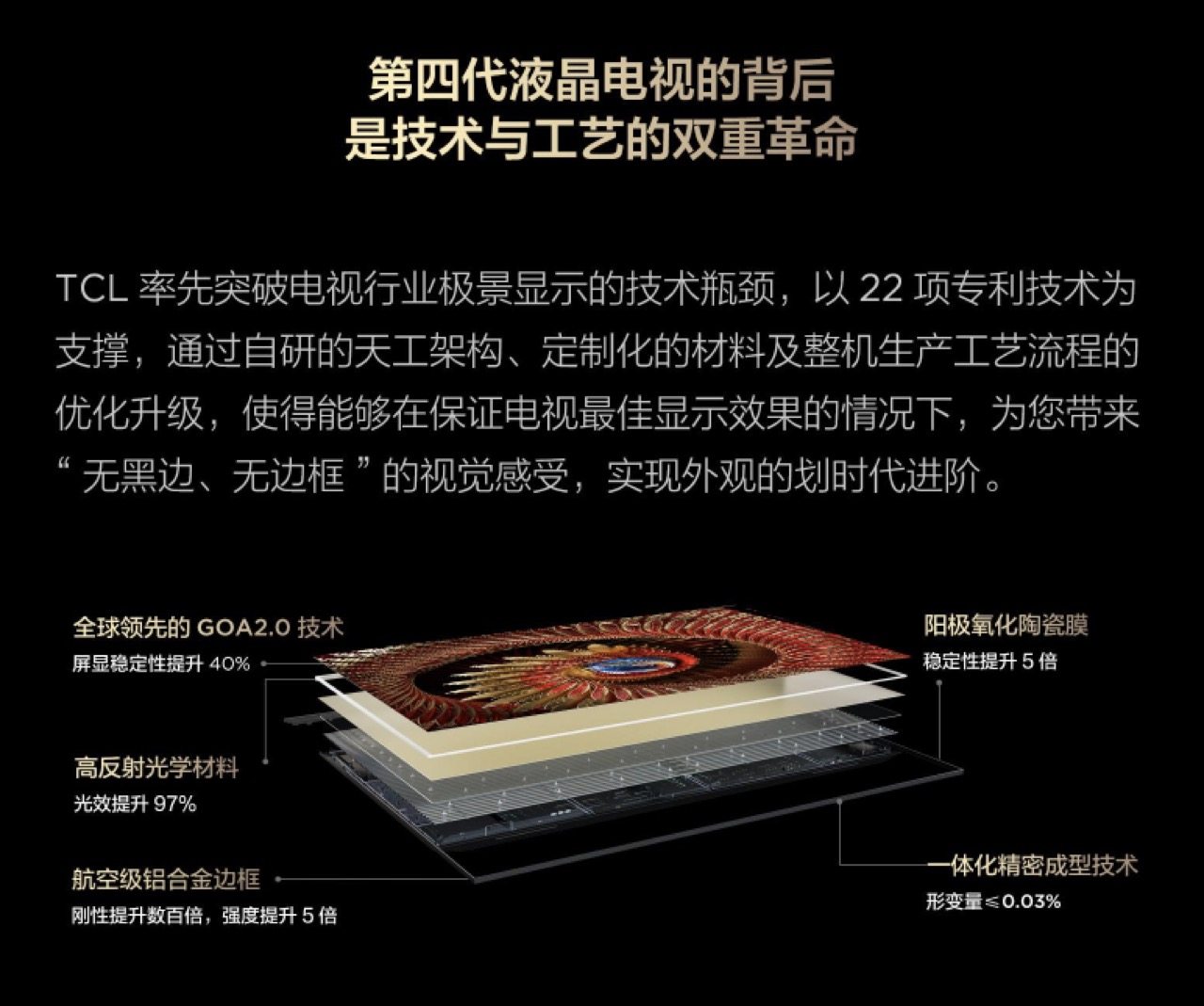 首先,TCL C12K以“极景·无黑边”设计,实现了行业期待了足足十年的“真·无黑边”效果。以22项专利技术沉淀为支撑,TCL通过对内部架构设计、定制化材料的研发及整机生产工艺流程的优化升级,在保证最佳显示效果的前提下呈现最佳外观,带来“无黑边、无边框”的视觉感受,实现外观的革命性进阶,打造了第四代液晶电视的新标杆。