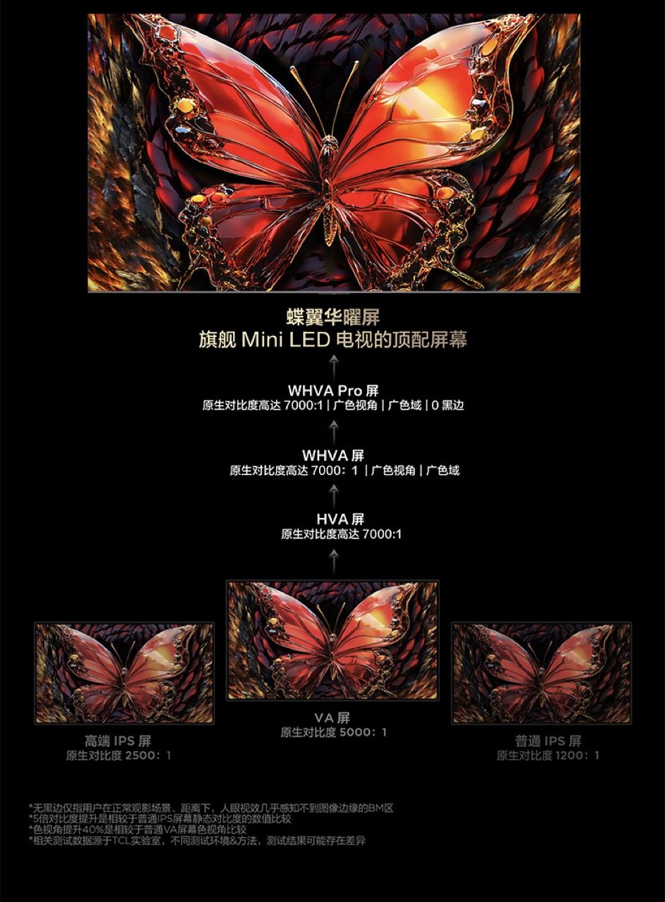 TCL C12K采用的蝶翼华曜屏,是TCL华星顶配屏幕,原生对比度达到7000:1,同时采用了行业最高级的0.5%反射率低反膜,降低环境光干扰,万象分区与蝶翼华曜屏组合,全面增强画质,实现一眼惊艳的显示效果,让TCL的品质表现始终如一。