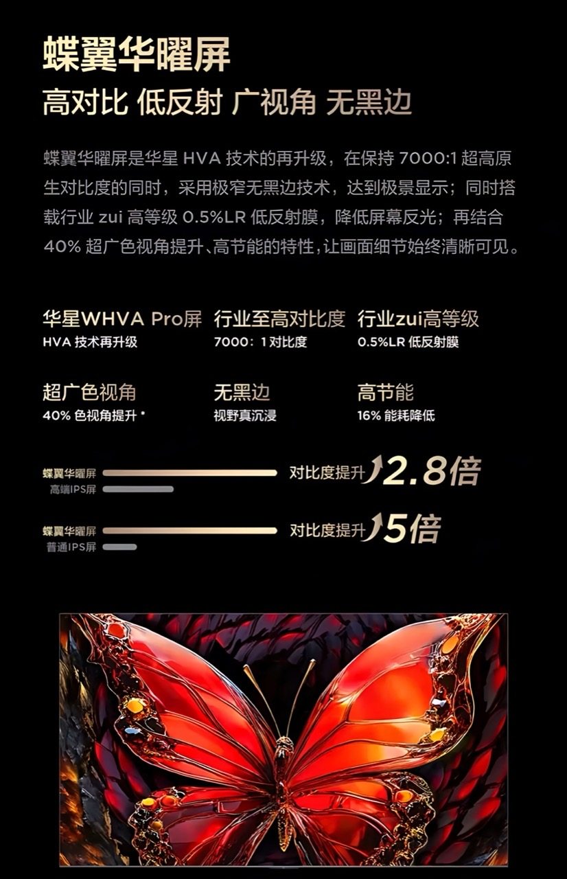 当然,第四代液晶电视的意义远不止于外观升级,它还承载了电视画质的跃迁式突破。Q10L系列搭载行业顶级的蝶翼华曜屏,作为华星HVA屏的巅峰之作,其原生对比度高达7000:1,拥有广色域,色视角提升40%,并采用行业最高端的0.5%超低反射率纳米低反膜,能有效降低环境光干扰,让画面更加清晰、通透。