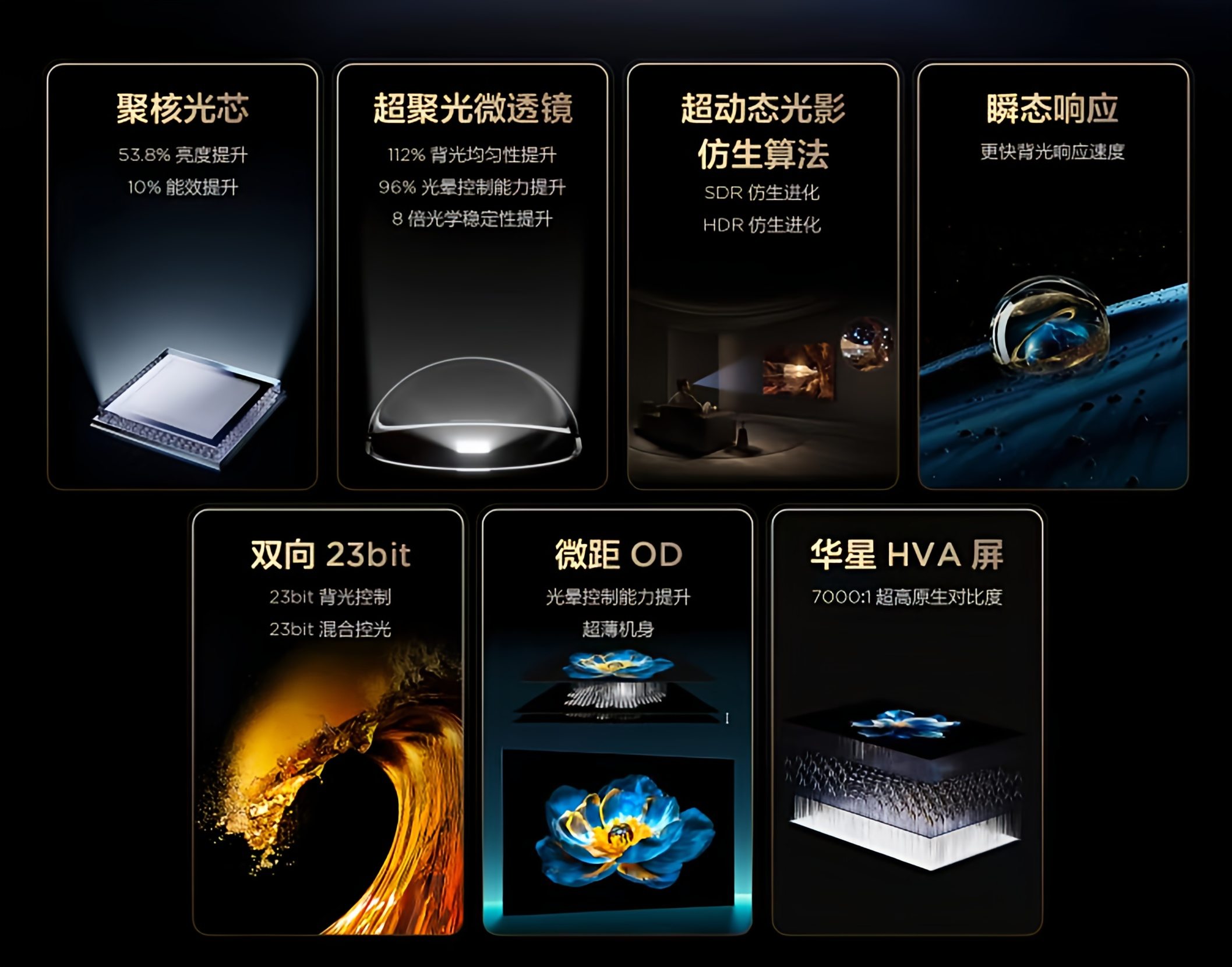 同时,蝶翼华曜屏还拥有40%的色视角提升,并采用了无黑边设计,最关键的是增加了一层行业顶级纳米低反膜,反射率仅0.5%,有效减少环境光反射,无论白天黑夜,画面纯净不泛白,为用户带来清晰、沉浸的观影体验。如果说华星HVA屏是Mini LED电视的黄金搭档,蝶翼华曜屏则是顶配中的顶配。