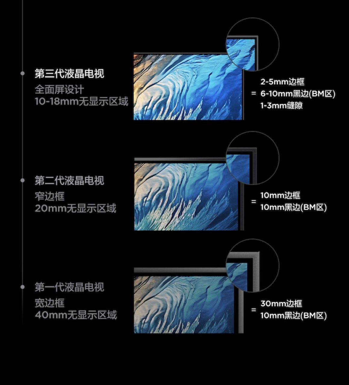 回顾前三代液晶电视的演化,第一代液晶电视是2011年及以前的宽边框液晶电视,非显示区域的边框+黑边宽40mm;第二代是2012年至2015年的窄边框液晶电视,非显示区域的边框+黑边宽20mm;第三代是2016年以来的全面屏液晶电视,即便称为“全面”,非显示区域的边框+黑边+缝隙的宽度也在10mm-18mm,行业内的液晶电视基本处在这个阶段。而TCL依托22项专利技术,推出极景·无黑边技术,彻底终结了液晶电视延续近十年的“黑边时代”。