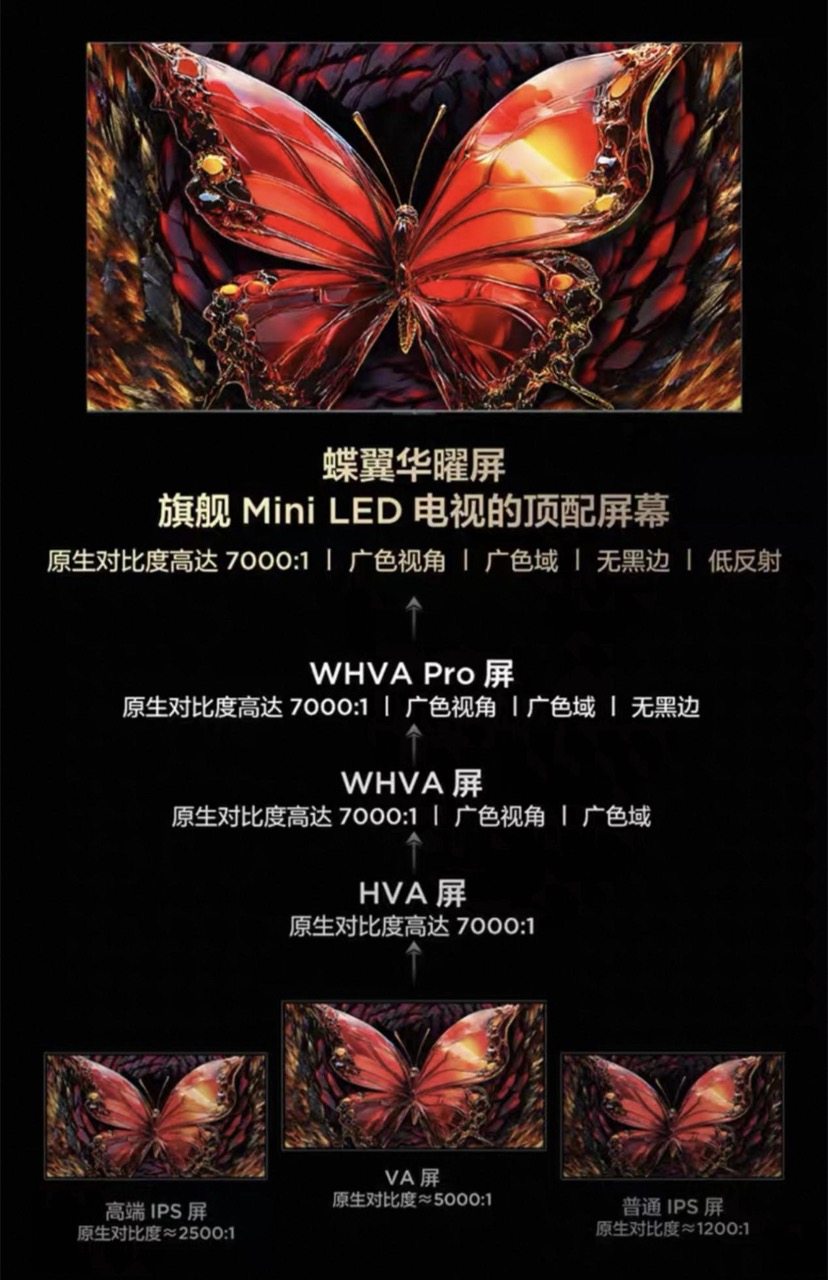 衡量一台 Mini LED 电视的品质,对比度和亮度是两个关键指标。高对比度能让画面层次分明,亮部与暗部细节清晰可见;合适的亮度则确保色彩鲜活,无论白天还是夜晚都能提供舒适的观影体验。而这两个指标与屏幕质量紧密相关,因此,选对屏幕是选购Mini LED电视的核心。