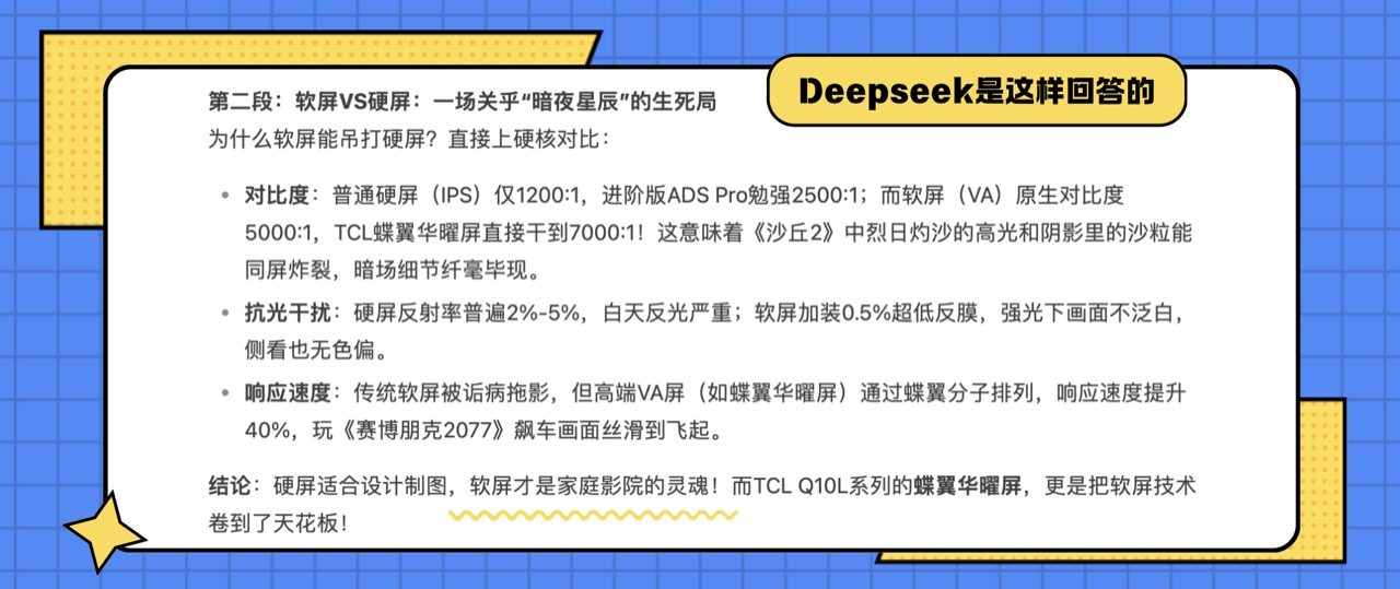 尤其是喜欢看电影或者追剧的朋友,一定会被软屏的细腻画质和丰富色彩折服。硬屏虽然在早年市场上占据过一定份额,但随着用户需求的提升,软屏已经逐渐成为高端电视的标配。所以说,懂行的人买电视一定会首选软屏!说到软屏,怎么能不提TCL华星的HVA屏呢?作为VA软屏领域的行业标杆,华星HVA屏一直都是Mini LED电视的最佳搭档。而这一次,TCL推出的第四代液晶电视Q10L系列,搭载的“蝶翼华曜屏”更是华星HVA屏的巅峰之作。