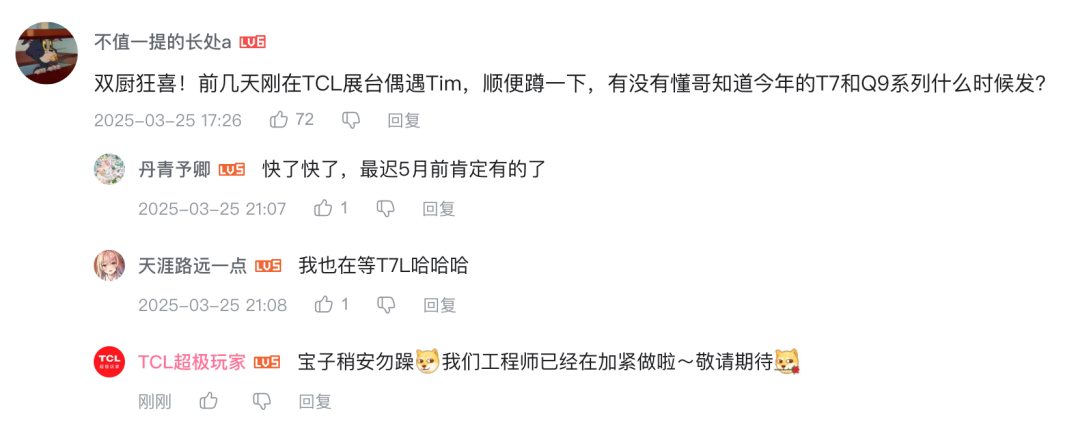 而就在今天,TCL的官微也是披露了一张倒计时海报,预告了3天后的3月20日20:00会有“2025 TCL QD-Mini LED电视新品发布会”,并且抢先告知了这次新品会搭载和手机系统一样好用的灵控系统3.0,势必是要让观影体验来一次更全方位的提升。结合着最近的品牌动态,感觉这场发布会应该会和大家期待的T7和Q9系列新品相关了。看来TCL官方也是关注到了用户的期待,早就准备好了一顿新品盛宴,至于这次的电视新品会不会像我们预测的那样走「科技平权」的路线,搭载上蝶翼星曜屏、万象分区甚至是量子点Pro 2025技术等,我们拭目以待,感兴趣可以关注TCL各大官方渠道。