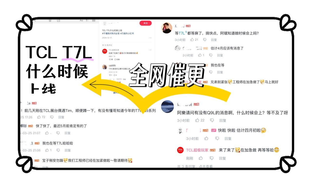 近期,微博、抖音、小红书等平台上,关于TCL T7L和Q9L系列新品的催更帖持续刷屏。“TCL快醒醒!T7L和Q9L到底哪天发布?”“有没有懂哥知道今年的T7L和Q9L系列什么时候出”在一条家电博主发布的小红书帖子下,网友纷纷留言询问与猜测,甚至不少网友喊话:“隔壁要开始卷了,你家神机还不来?”