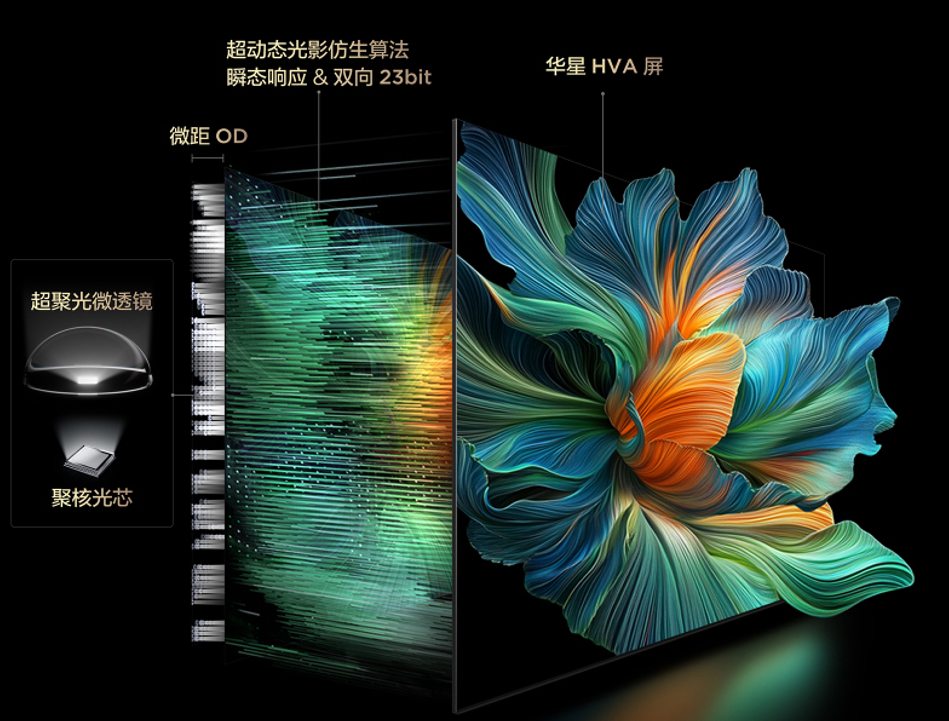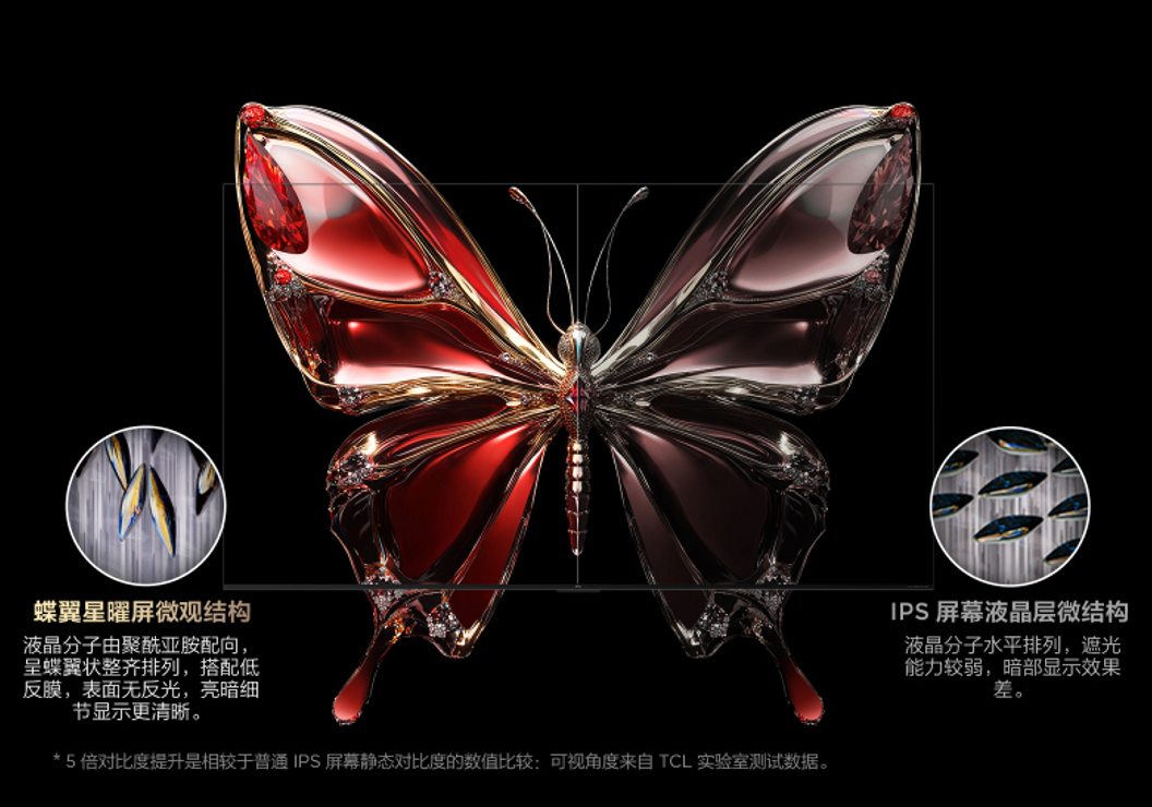 相较于普通VA屏5000:1的对比度,蝶翼星曜屏的原生对比度高达7000:1,比普通IPS硬屏(1200:1)更是高5倍,由于采用了纳米级仿生材料,并且液晶分子呈现“蝶翼”状排列,因此无论是动态亦或是静态的对比度都更加出色,画面细节更加细腻,且有效降低屏幕反光问题!都说电视画质的好坏,屏幕占一半,因此,这次蝶翼星曜屏技术的下放,使得这次新品的市场竞争力也是得到了大飞跃。