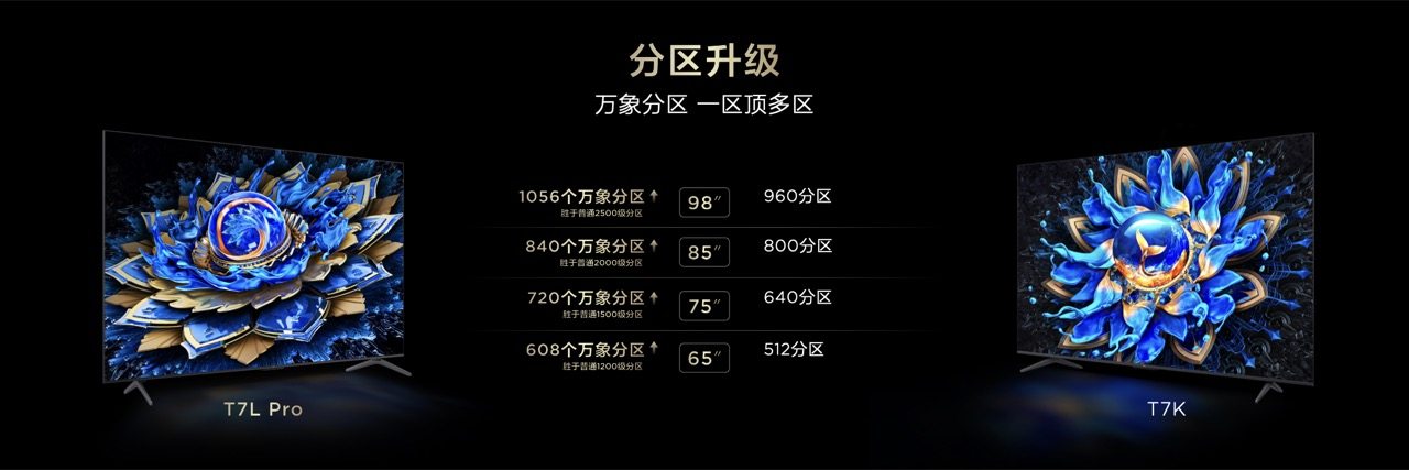 这到底是怎么回事呢?其实是T7L Pro系列和Q9L Pro系列搭载了万象分区控光技术,这可不是单纯的堆砌分区数量,而是一整套系统级的Mini LED控光方案。从电视背光到成像显示的7大环节优化升级,最终实现一区顶多区的控光效果,这就相当于1个万象分区可以实现2倍的控光精度,主打性能越级。