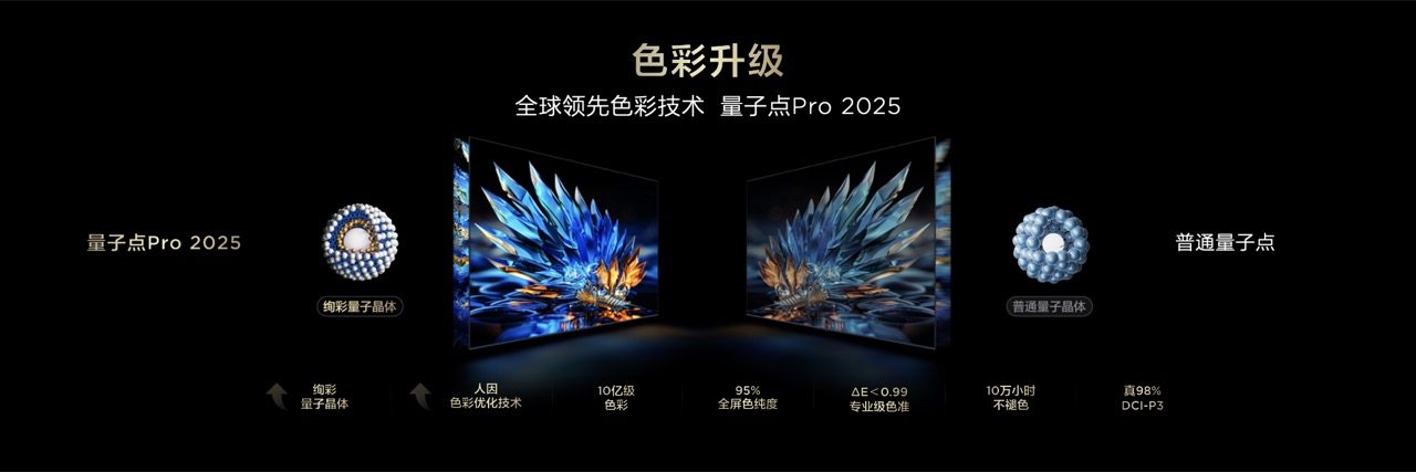 当然,画质好不仅仅是底层的控光技术到位,色彩还原同样很重要。此次,新品还搭载了最新的量子点Pro 2025,相比上一代量子点Pro2024,它的亮点有两个:材料升级和人因色彩优化。首先在材料上,由四元量子晶体升级成绚彩量子晶体,实现了真·98%DCI-P3超高色域、色准ΔE<0.99、全屏色纯度达95%,能够做到10万小时不褪色,色彩始终在线。再加上人因色彩优化技术,能够根据人眼感知调整画面,一五一十还原你肉眼中的现实世界,让画面既鲜艳又自然,颜色不刺眼,眼睛也更舒服。