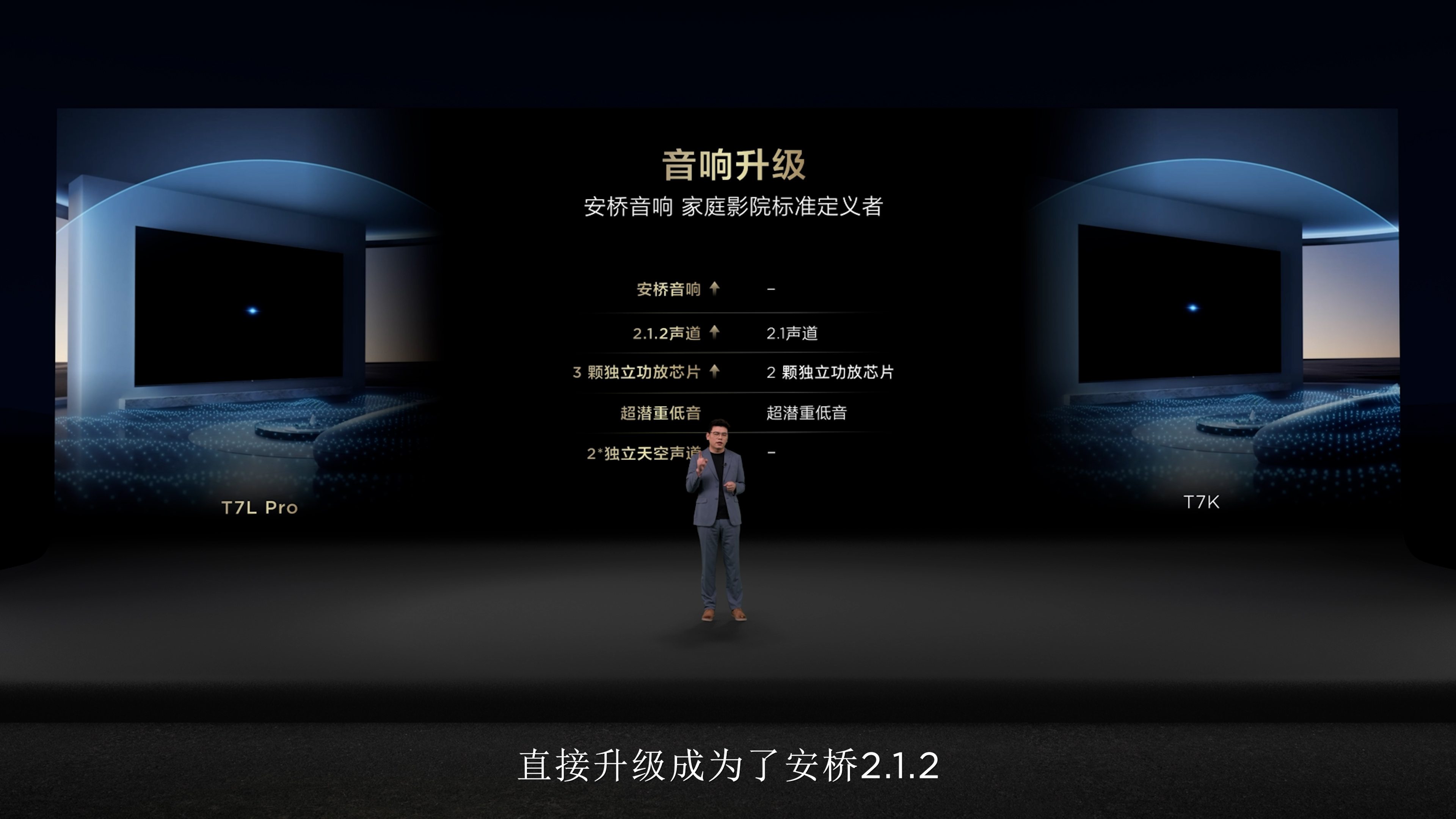 视觉效果到位了,音响也得跟上才能带来更沉浸式的观影体验。T7L系列和T9L系列采用的是安桥2.1.2的5声道Hi-Fi级专业音响,配备的超潜重低音炮,让声音更加震撼。新增的两个天空声道搭配杜比全景声技术,能够让用户感受到360°全方位3D立体环绕的声场效果。