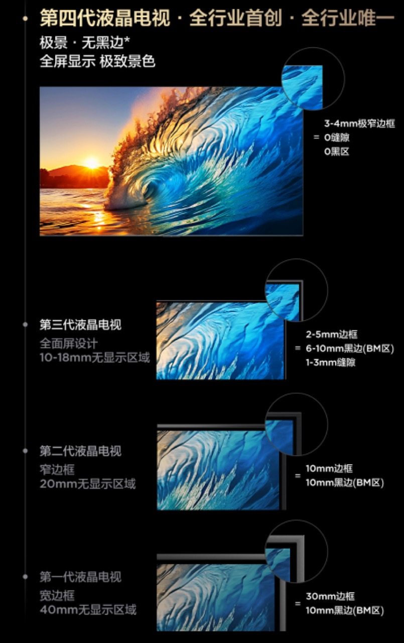 都知道,科技圈的成功从不是一朝一夕,从传统厚边框到全面屏设计,液晶电视历经几十年的技术迭代,可视面积从早期的第一代液晶电视的可视面积87%提升至到第三代液晶电视的95%-97%,原本以为已是极限,但TCL的研发团队可不满足于此!