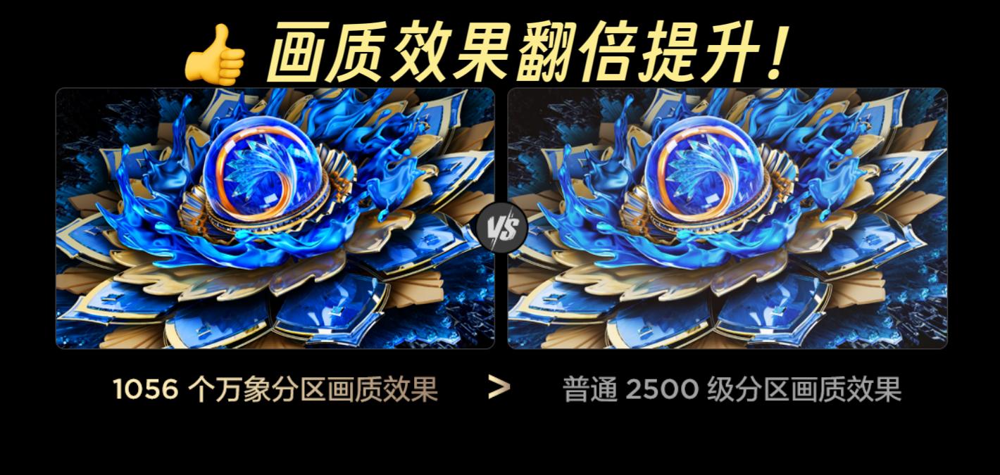 普通分区还不行,毕竟有边际递减效应,增加再多数量也是做“无用功”,而在“一区顶多区”的万象分区面前事情就变得简单多了!这次新品从之前的普通Mini LED分区升级成了万象分区,控光实力翻倍提升。而这背后全得益于TCL从背光到成像的7大关键环节软硬件做了升级,包括:聚核光芯、超聚光微透镜、微距OD、瞬态响应等,听起来很复杂,但是只要记住,这一系列的高端技术可以进行系统性的精准控光即可,最终,万象分区的控光实力可以比普通分区强数倍,咱就以98吋的T7L Pro为例,你可别看他只搭载了1056个万象分区,但是相较于去年的T7K不仅在数量上提升了,实际画质效果提升了两倍以上!当别家还在挤牙膏一样及普通分区数,TCL就已经开始玩“质的飞跃”。