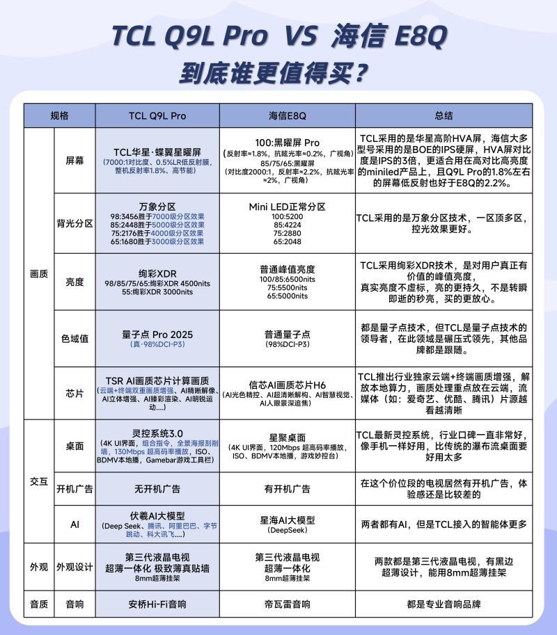 不难看出,TCL T7L、Q9L系列新品无论是画质、音效还是操控都无懈可击,尤其是Q9L Pro,相较于同级别竞品,比如说海信E8Q,更是遥遥领先。