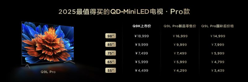 在价格方面,T7L Pro的起售价国补后仅为3839元,Q9L Pro则只需要3439元,而55吋的T7L更是只要2799元。最给力的是,从3月30日到4月15日期间,购买T7或Q9系列新品,花799元就能带走一台专业级音响Z100,享受更丰富的影音体验。