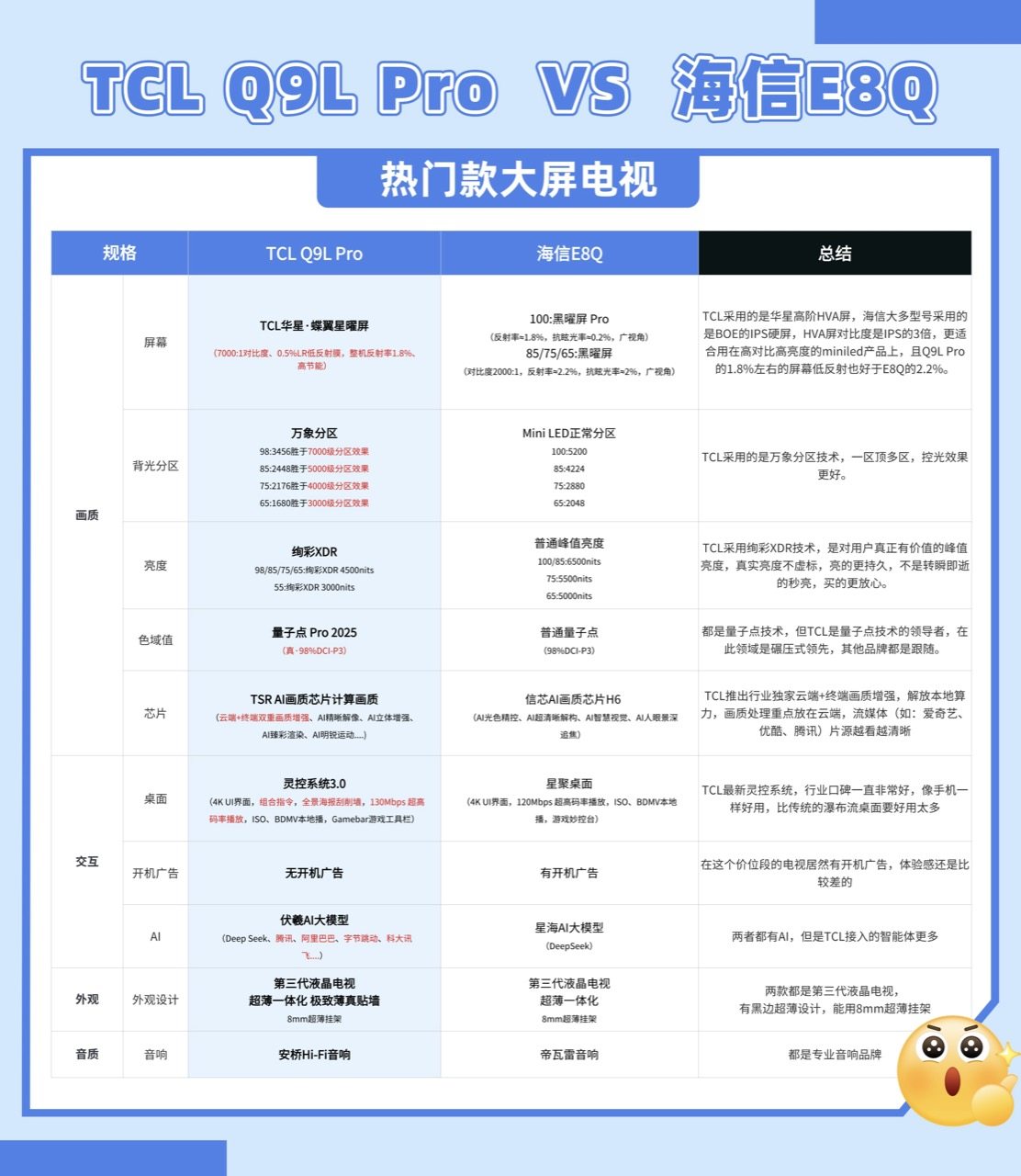 这么多高端配置的强强组合,这两款新品堪称是无敌的存在,尤其是Q9L Pro,远超其他同级别的竞品,比如说同期上线的海信E8N,无论是在画质、色彩还是智能操控上,都是有非常明显的优势。