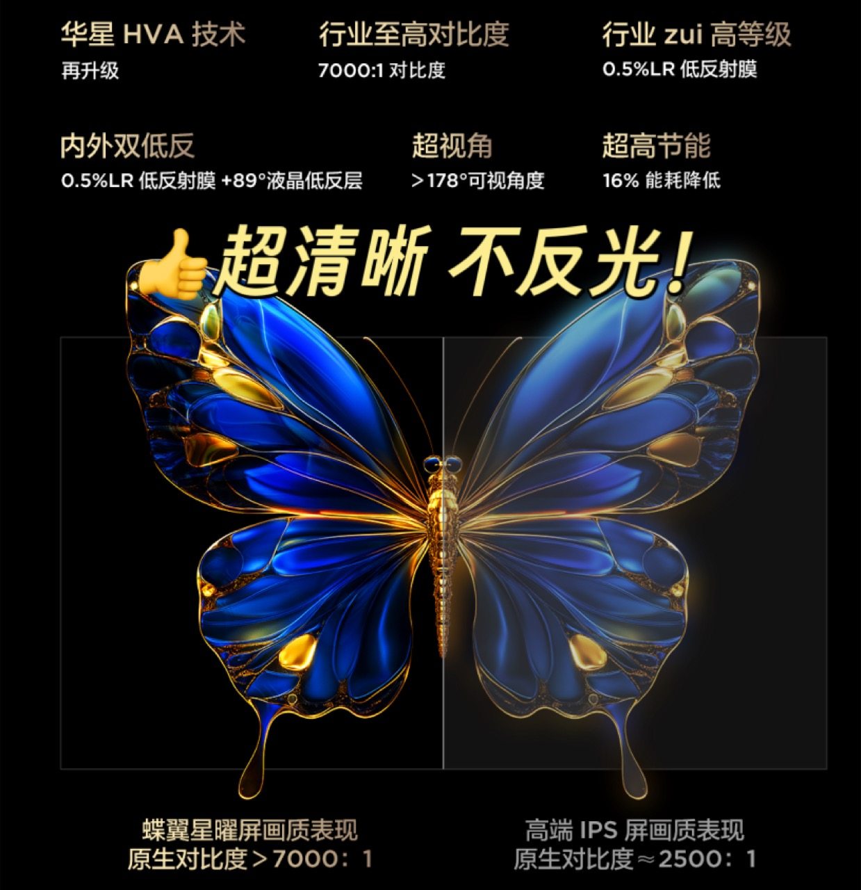 首先,在类型上记住必须选VA软屏,相较于仅有1200:1对比度的IPS硬屏而言,VA软屏直接赢在了起跑线上。而VA屏的进阶版——华星HVA旗舰屏对比度更是高达7000:1,是IPS屏的5倍!而这次T7L Pro及Q9L Pro系列搭载的蝶翼星曜屏正是属于这类,由此带来的画面清晰度可以做到极致,就连过去看不清楚的暗场细节也都能显露无遗。